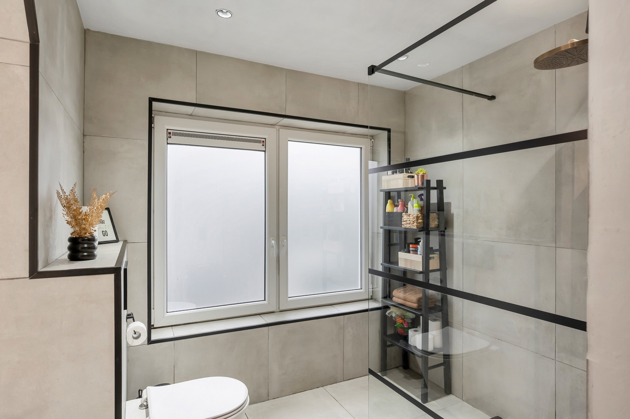 - Badkamer met douche, toilet en lavabomeubel