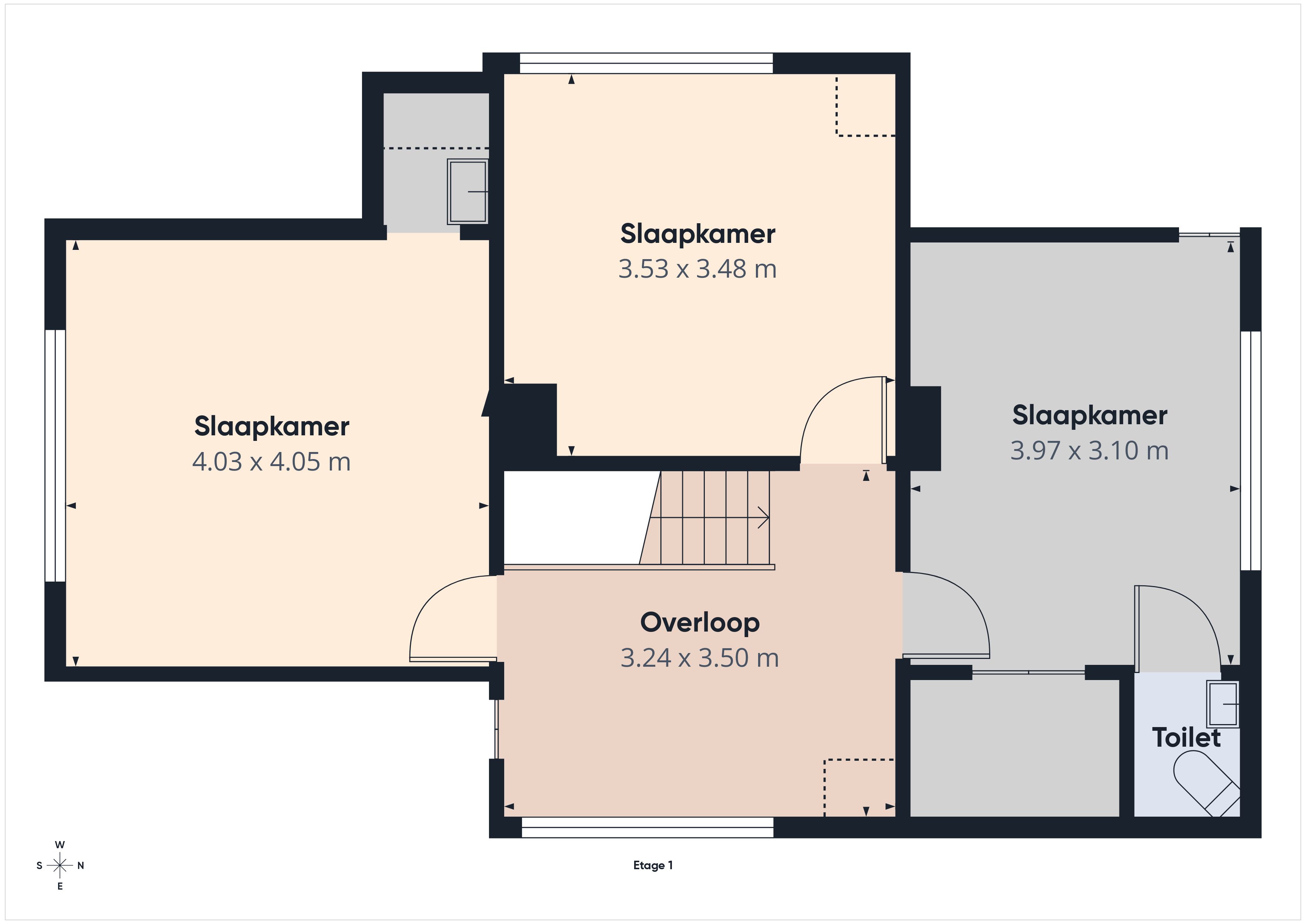 De vaste hardhouten trap in de inkomhal brengt u naar de eerste verdieping. Hier bevinden zich 3 ruime slaapkamers, allen voorzien van wastafel (één ervan is bovendien voorzien van eigen toiletruimte).