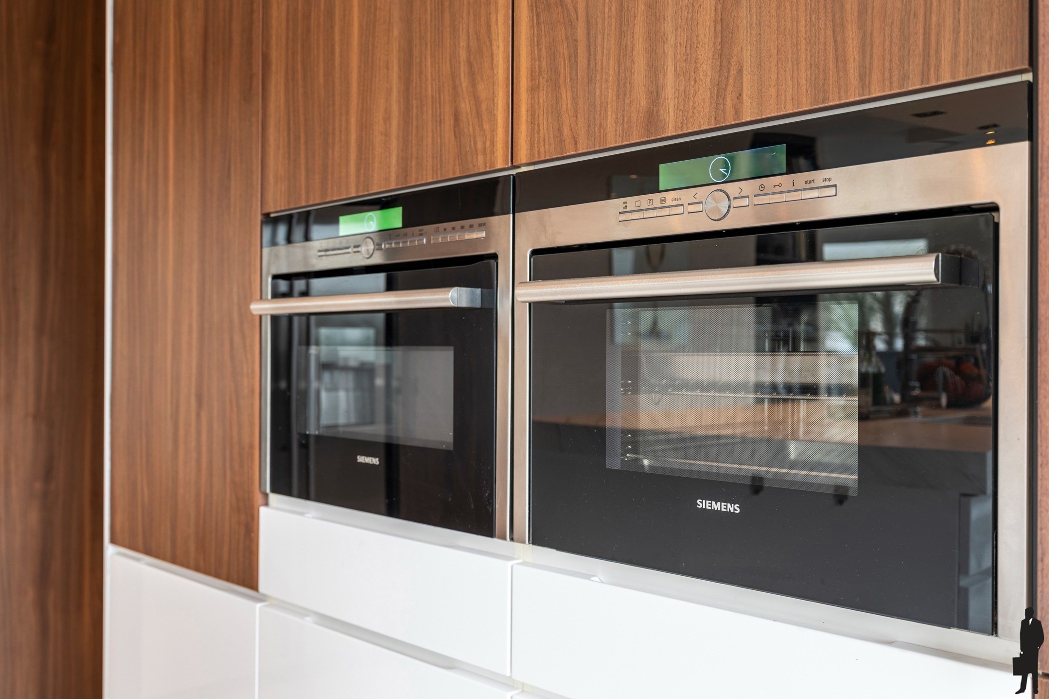 Aansluitend aan de keuken bevindt zich de eetkamer, die voldoende ruimte biedt voor gezellige familiemomenten of het ontvangen van gasten. De keuken zelf is een ware droom voor elke kookliefhebber: ze is uitgerust met een composiet werkblad, overvloedige kastruimte en een doordachte indeling. De hoogwaardige toestellen omvatten onder meer een inductiekookvuur, stoomoven, combi-oven, vaatwasser, afzuigkap met randafzuiging en een practische coffee corner voorzien van indirecte verlichting. Grote schuiframen geven rechtstreeks toegang tot het terras, waardoor binnen en buiten naadloos in elkaar overlopen.